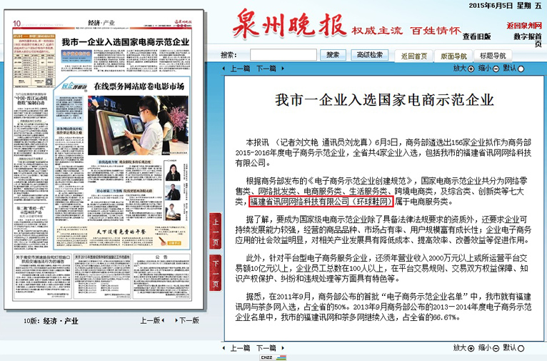 據悉,在2011年9月,商務部公布的首批“電子商務示范企業名單”中,我市就有福建訊網與茶多網入選,占全省的50%。2013年9月商務部公布的2013—2014年度電子商務示范企業名單中,我市的福建訊網和茶多網繼續入選,占全省的66.67%。