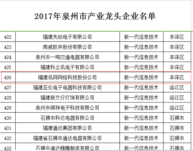 近日,經(jīng)泉州市政府同意,泉州市建設(shè)制造業(yè)強(qiáng)市領(lǐng)導(dǎo)小組辦公室在泉州市經(jīng)信委官網(wǎng)發(fā)布《2017年泉州市產(chǎn)業(yè)龍頭企業(yè)名單》,共有502家企業(yè)入選,訊網(wǎng)網(wǎng)絡(luò)榜上有名,成為29家“新一代信息技術(shù)”龍頭企業(yè)的一員。