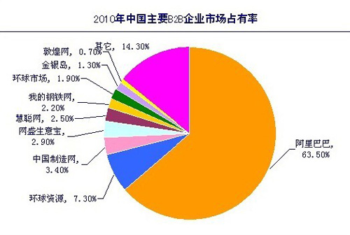 據中國電子商務研究中心即將發布的《2010年度中國行業電子商務網站調查報告》數據顯示:2010年,從營收規模上看,綜合類電子商務服務商的市場份額排名中,阿里巴巴以63.5%的市場占有率位居第一,環球資源以7.3%的市場份額排名第二,排在第三的則為焦點科技(中國制造網),市場份額為3.4%,排在第四的網盛生意寶份額為2.9%,慧聰網則以2.5%的市場份額位列第五,我的鋼鐵網占比2.20%、剩余的份額則被環球市場、金銀島、敦煌網等其它靠后幾家服務商所瓜分。